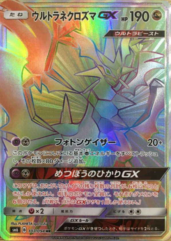ウルトラネクロズマGX(107/094)は、ドラゴンタイプのたねポケモンで、HP190を持ちます。ワザ「フォトンゲイザー」は、超エネルギー1個と鋼エネルギー1個で20ダメージを与え、このポケモンについている基本エネルギーをすべてトラッシュし、その枚数×80ダメージを追加します。GXワザ「めつぼうのひかりGX」は、お互いのサイドの残り枚数の合計が6枚以下のときにのみ使用可能で、相手のポケモン全員にそれぞれダメカンを6個乗せる強力な効果を持ちます。これらのワザにより、高火力の攻撃や広範囲へのダメージを狙う戦略が可能です。HR(ハイパーレア)版のイラストは、虹色の光沢を持つ特別なデザインが施され、コレクターズアイテムとしても高い人気を誇ります。また、このカードにはエラー版(カード表面加工なし)と修正版(カード表面加工あり)が存在し、エラー版は特に希少価値が高いとされています。