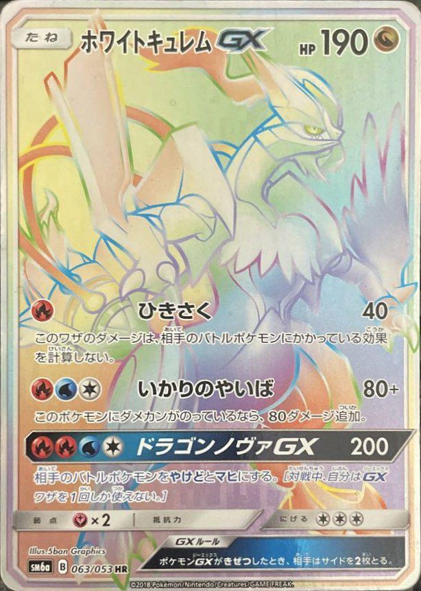 ホワイトキュレムGX(063/053)は、強化拡張パック「ドラゴンストーム」に収録されたドラゴンタイプのたねポケモンGXで、HPは190です。技「ひきさく」は炎エネルギー1個で40ダメージを与え、相手のバトルポケモンにかかっている効果を無視します。「いかりのやいば」は炎エネルギー1個、水エネルギー1個、無色エネルギー1個で80ダメージを与え、このポケモンにダメカンが乗っている場合、追加で80ダメージを与えます。GX技「ドラゴンノヴァGX」は炎エネルギー2個、水エネルギー1個、無色エネルギー1個で200ダメージを与え、相手のバトルポケモンをやけどとマヒにします。弱点はフェアリータイプで、逃げるためのエネルギーは3個必要です。ハイパーレア(HR)仕様のため、豪華なイラストが特徴で、コレクション価値も高い一枚です。