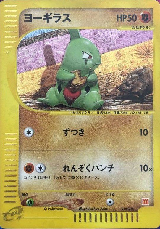 ヨーギラス(018/018)は、マクドナルドオリジナルの「ミニマム★パック」に収録されたプロモーションカードです。闘タイプのたねポケモンで、進化先のサナギラスやバンギラスへの布石として序盤の戦略に組み込むことができます。このプロモカードは、マクドナルドとのコラボレーションによる限定配布で、希少価値が高く、コレクターズアイテムとして人気があります。