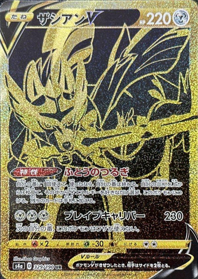 ザシアンV(329/190)は、鋼タイプのたねポケモンで、HP220を持ちます。特性「ふとうのつるぎ」は、自分の番に1回使え、使用後は自分の番が終わります。この特性により、山札の上から3枚を見て、その中の鋼エネルギーを好きなだけこのポケモンにつけ、残りを手札に加えます。技「ブレイブキャリバー」は、鋼エネルギー3個で230ダメージを与え、次の自分の番、このポケモンはワザが使えません。デッキでは、特性を活かしてエネルギー加速を行い、強力な攻撃を早期に繰り出す戦略が有効です。また、UR(ウルトラレア)版のカードは、金と黒の高級感のあるデザインが特徴で、コレクターズアイテムとしても高い価値があります。