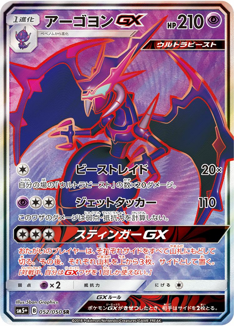 「アーゴヨンGX」(052/050)は、超タイプの1進化ポケモンGXで、特性「チャージアップ」により、毎ターン1回、トラッシュから超エネルギーを自身に付けることができます。ワザ「フォトンゲイザー」は、超エネルギーを1個トラッシュすることで、80ダメージを追加し、合計160ダメージを与えることが可能です。GXワザ「ライティングGX」は、相手のバトルポケモンを麻痺状態にし、追加でエネルギーを付けている場合、さらに6枚の手札を引くことができます。エネルギー加速と高火力を兼ね備え、デッキのエネルギー管理をサポートする役割を持ちます。SR(スーパーレア)版は、イラストレーター5ban Graphics氏による美麗なイラストが特徴で、コレクターから高い評価を受けています。