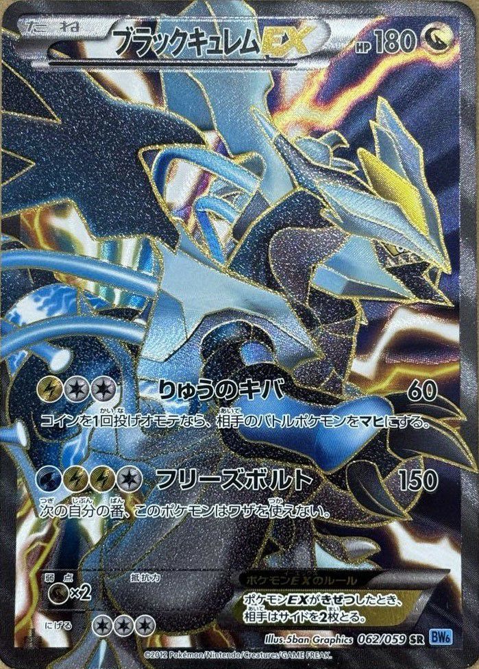 ブラックキュレムEX(062/059)[SR]は、拡張パック「フリーズボルト」に収録されたドラゴンタイプのたねポケモンで、HPは180です。ワザ「りゅうのキバ」は雷エネルギー1個と無色エネルギー2個で60ダメージを与え、コインを1回投げてオモテなら相手のバトルポケモンをマヒにします。「フリーズボルト」は水エネルギー1個、雷エネルギー2個、無色エネルギー1個で150ダメージを与え、次の自分の番、このポケモンはワザを使えません。弱点はドラゴンタイプ(×2)、逃げるためのコストは無色エネルギー3個です。SR(スーパーレア)仕様の特別なイラストが施されており、コレクション性が高いカードです。