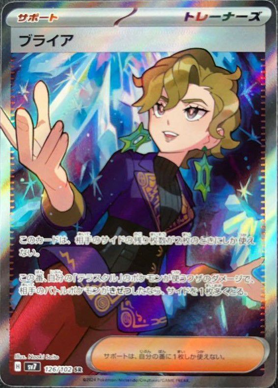 ブライア(126/102)[SR]は、拡張パック「ステラミラクル」に収録されたサポートカードのスーパーレア(SR)バージョンです。このカードは、相手のサイドの残り枚数が2枚のときにのみ使用可能で、その番に自分の「テラスタル」ポケモンがワザで相手のバトルポケモンをきぜつさせると、サイドを1枚多く取ることができます。これにより、試合の終盤での逆転や勝利を狙う戦略が可能となります。SR仕様のカードは、光沢のある特別なデザインが施されており、コレクション性も高いです。