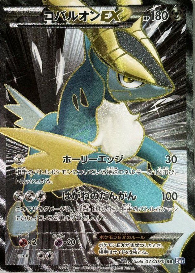 コバルオンEX(073/070)は、拡張パック「プラズマゲイル」に収録された鋼タイプのたねポケモンEXで、HPは180です。ワザ「ホーリーエッジ」は30ダメージを与え、相手のバトルポケモンについている特殊エネルギーを1個トラッシュします。また、「はがねのだんがん」は100ダメージを与え、このワザのダメージは弱点・抵抗力や相手のバトルポケモンにかかっている効果の計算を無視します。ポケモンEXがきぜつしたとき、相手はサイドを2枚取ります。イラストは上田リョウ氏が担当し、コバルオンの力強い姿が描かれています。