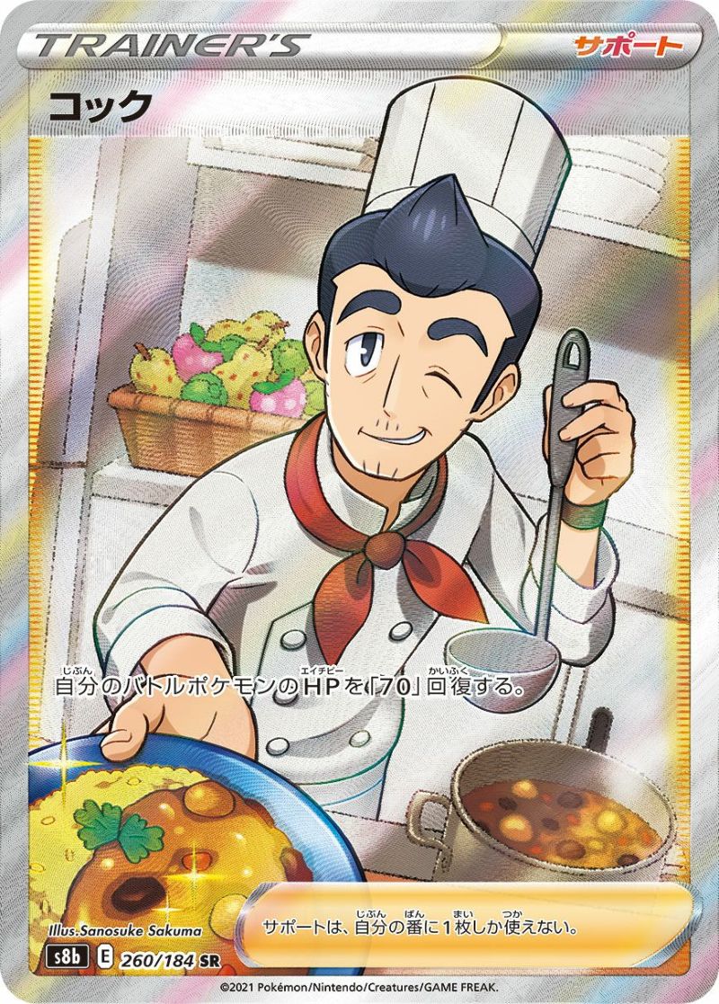 コック(260/184)は、ハイクラスパック「VMAXクライマックス」に収録されたサポートカードで、イラストレーターはSanosuke Sakuma氏が担当しています。このカードを使用すると、自分のバトルポケモンのHPを70回復することができます。サポートカードは1ターンに1枚しか使えないため、使用タイミングが重要です。ウルトラレア(SR)仕様のため、コレクション価値も高い一枚です。
