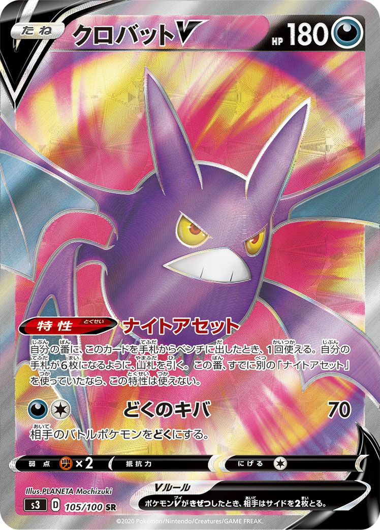 クロバットV(105/100)[SR]は、悪タイプのたねポケモンで、HP180を持ちます。特性「ナイトアセット」は、このカードを手札からベンチに出したときに1回使え、手札が6枚になるまで山札からカードを引くことができます。この特性は、デッキの安定性を高めるため、多くのデッキで採用されています。技「どくのキバ」は、悪エネルギー1個と無色エネルギー1個で70ダメージを与え、相手のバトルポケモンをどく状態にします。スーパーレア(SR)版は、特別な光沢加工が施され、コレクション性が高い一枚です。このカードは、拡張パック「ムゲンゾーン」に収録されています。