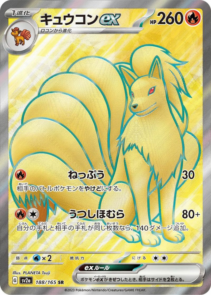 キュウコンex(188/165)は、強化拡張パック「ポケモンカード151」に収録された炎タイプの1進化ポケモンで、HPは260です。ワザ「ねっぷう」は炎エネルギー1個で30ダメージを与え、相手のバトルポケモンをやけど状態にします。「うつしほむら」は炎エネルギー1個と無色エネルギー1個で80ダメージを与え、自分と相手の手札が同じ枚数であれば、追加で140ダメージを与えます。これにより、最大220ダメージを狙うことが可能で、手札管理が戦略の鍵となります。SR(スーパーレア)版は、特別なイラストが施され、コレクション性が高いです。