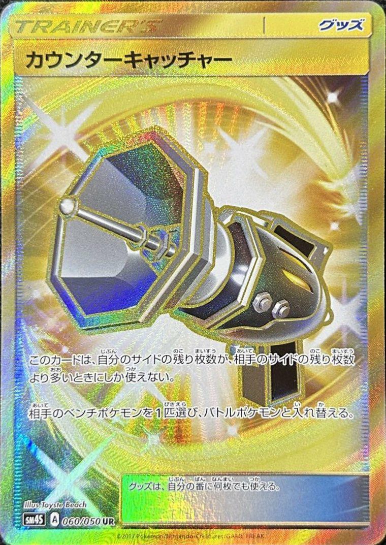 カウンターキャッチャー(060/050)は、拡張パック「覚醒の勇者」に収録されたグッズカードです。自分のサイドの残り枚数が相手より多いときにのみ使用可能で、相手のベンチポケモン1匹を選び、バトルポケモンと入れ替えます。デッキでは、劣勢時に相手の要注意ポケモンを引き出し、戦況を有利に進める戦術で活躍します。UR(ウルトラレア)版のカードは、特別なホログラフィック加工が施され、美麗なデザインが特徴です。