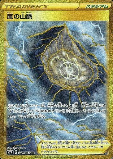 嵐の山脈(089/067)は、拡張パック「蒼空ストリーム」に収録されたウルトラレア(UR)のスタジアムカードです。このカードは、雷タイプまたはドラゴンタイプのたねポケモンを山札から直接ベンチに出すことができ、これらのデッキにおける展開をサポートします。UR版のイラストは、カード全体が金色に輝く豪華なデザインが特徴です。