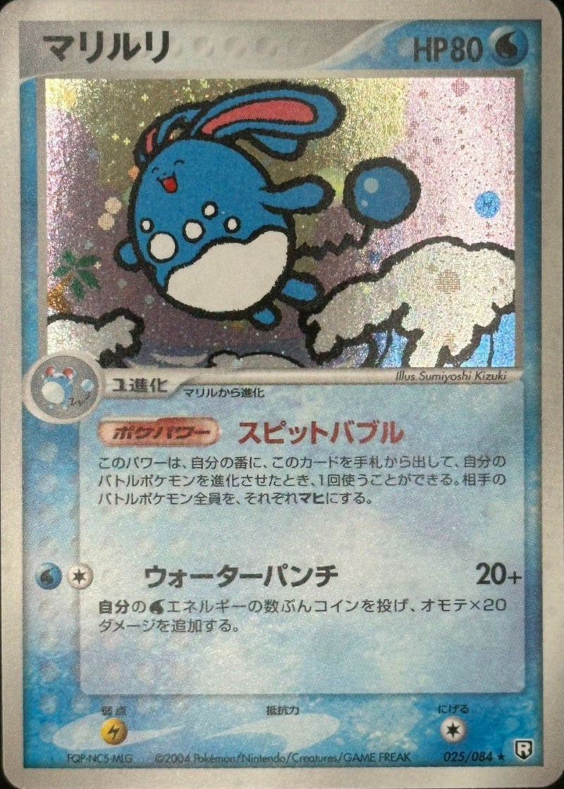 マリルリ(025/084)は、拡張パック「ロケット団の逆襲」に収録された水タイプの1進化ポケモンで、HP70を持ちます。ワザ「スピットバブル」は水エネルギー1つで10ダメージを与え、相手のバトルポケモンをマヒ状態にする可能性があります。また、「たきのぼり」は水エネルギー2つと無色エネルギー1つで40ダメージを与えます。逃げるためのエネルギーコストは無色1つ、弱点は雷タイプです。このカードはキラ仕様で、マリルリの魅力が際立つデザインとなっています。