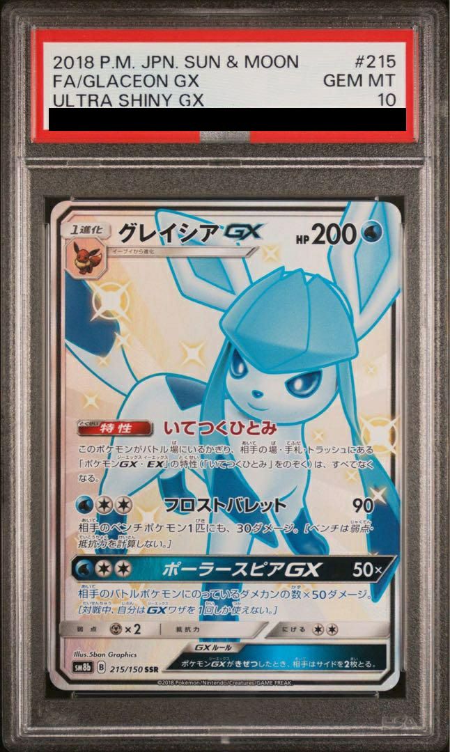 グレイシアGX(215/150)[SSR]は、水タイプの1進化ポケモンで、HP200を持ちます。特性「いてつくひとみ」は、このポケモンがバトル場にいる限り、相手の場・手札・トラッシュにある「ポケモンGX・EX」の特性をすべて無効化します。技「フロストバレット」は、水エネルギー1個と無色エネルギー2個で90ダメージを与え、相手のベンチポケモン1匹にも30ダメージを追加します。GXワザ「ポーラースピアGX」は、相手のバトルポケモンに乗っているダメカンの数×50ダメージを与える強力な技です。このカードは、ハイクラスパック「GXウルトラシャイニー」に収録されています。SSR(色違いスーパーレア)版は、色違いのグレイシアが描かれた特別なイラストと光沢加工が施され、コレクション性が高い一枚です。