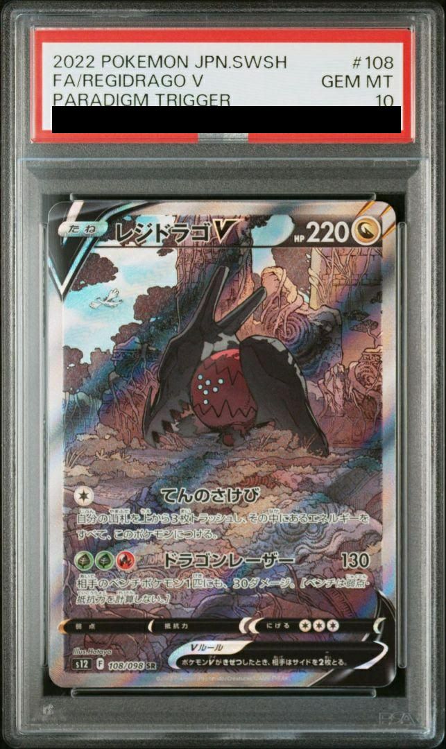 レジドラゴV(108/098)[SR]は、ドラゴンタイプのたねポケモンで、HP220を持ちます。ワザ「てんのさけび」は、自分の山札を上から3枚トラッシュし、その中のエネルギーをすべてこのポケモンに付けることができます。「ドラゴンレーザー」は、無色エネルギー3個で130ダメージを与え、相手のベンチポケモン1匹にも30ダメージを与えます。これらのワザにより、エネルギー加速と広範囲の攻撃が可能です。イラストはHataya氏が担当しています。