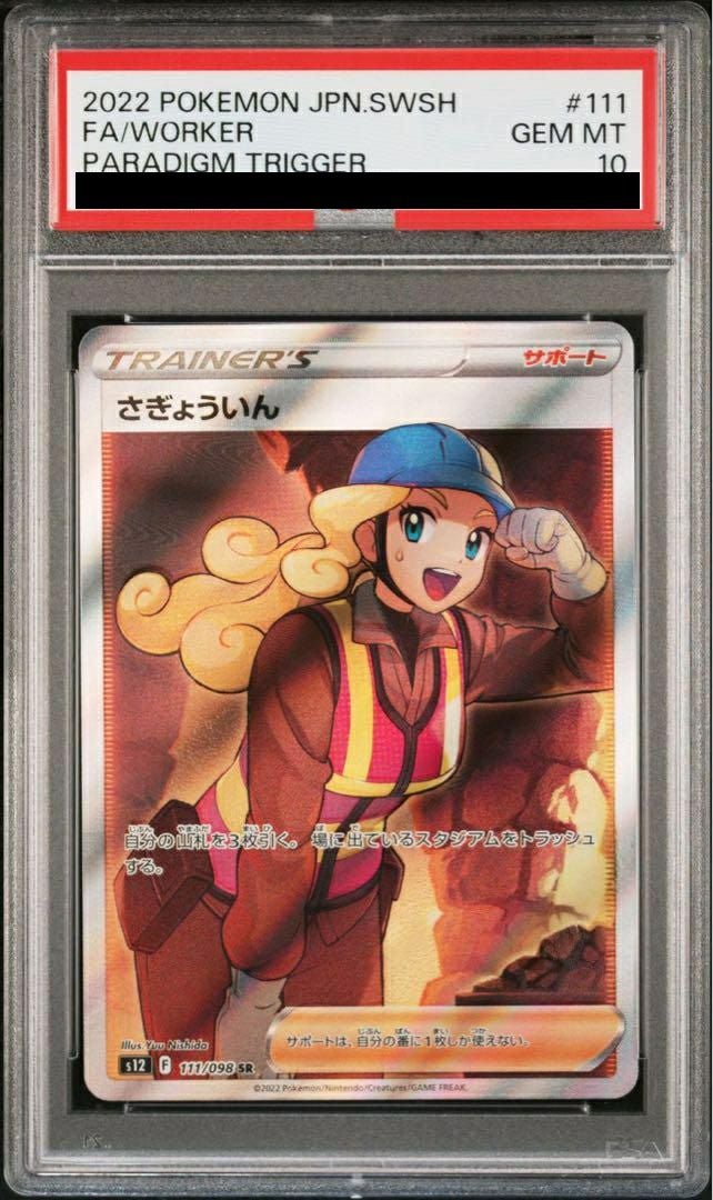さぎょういん(111/098)[SR]は、拡張パック「パラダイムトリガー」に収録されたサポートカードで、山札から3枚引き、場に出ているスタジアムをトラッシュする効果を持ちます。これにより、手札補充とスタジアムの除去が同時に行え、デッキの安定性と相手の戦略妨害に役立ちます。イラストは西田ユウ氏が担当しており、女性作業員の可愛らしいデザインが特徴です。発売当初は高値で取引されていましたが、現在は市場価格が落ち着いています。