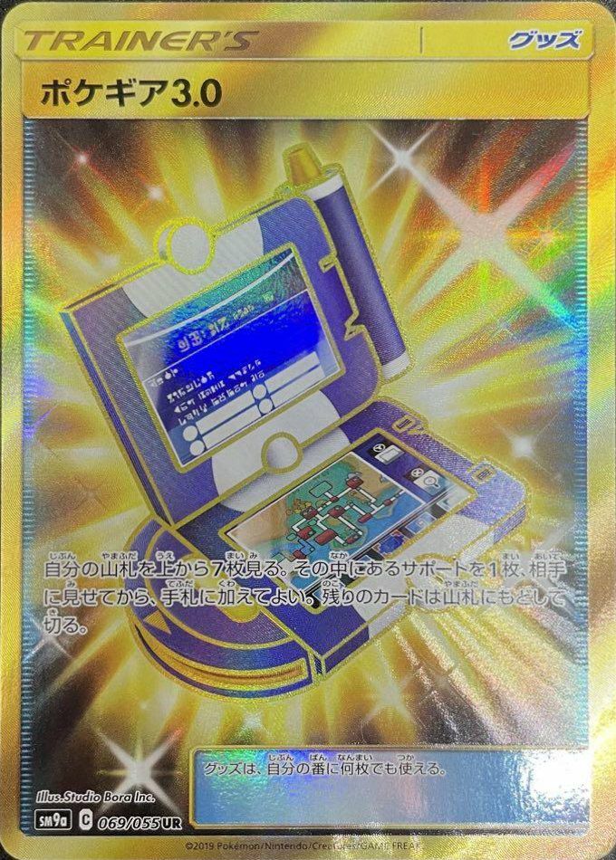 ポケギア3.0(069/055)は、トレーナーズのグッズカードで、自分の山札の上から7枚を見て、その中からサポートカードを1枚選び、手札に加えることができます。デッキの安定性を高め、必要なサポートカードを迅速に手札に加えるサポート役として活躍します。UR版は、金色の放射線が存在する背景の中で、金色の枠で囲んだポケギア3.0がCGで描かれた豪華なデザインが特徴です。