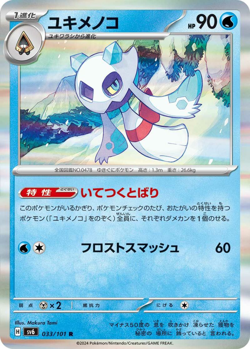 ユキメノコ(033/101)は、拡張パック「変幻の仮面」に収録された水タイプの1進化ポケモンカードです。特性「いてつくとばり」により、このポケモンが場にいる限り、ポケモンチェックのたびにお互いの特性を持つポケモン(「ユキメノコ」を除く)全員に、それぞれダメカンを1個のせます。ワザ「フロストスマッシュ」は、水エネルギー1個で60ダメージを与えます。弱点は鋼タイプ(×2)、抵抗力はなく、逃げるためのエネルギーは1個です。イラストはMakura Tami氏が担当しています。