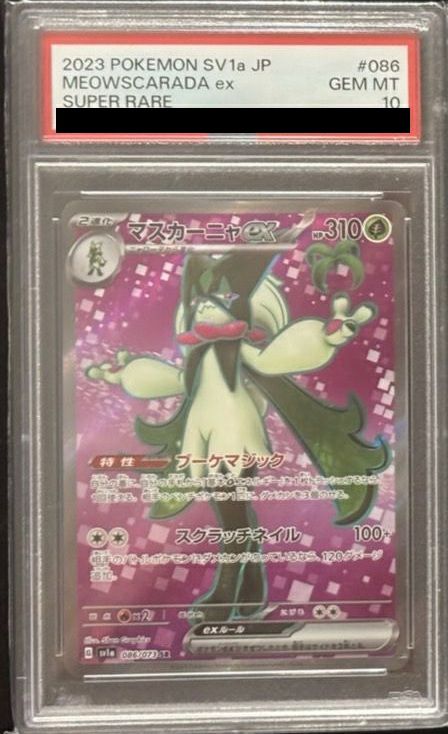 マスカーニャex(086/073)は、草タイプの2進化ポケモンで、HPは310です。特性「ブーケマジック」により、自分の手札から基本草エネルギーを1枚トラッシュすることで、相手のベンチポケモン1匹にダメカンを3個のせることができます。ワザ「スクラッチネイル」は無色エネルギー2個で使用でき、基本ダメージ100に加え、相手のバトルポケモンにダメカンがのっている場合、追加で120ダメージを与えます。このカードは、強化拡張パック「トリプレットビート」に収録されています。SR(スーパーレア)版は、特別なイラストとホログラフィック加工が施された豪華なデザインが特徴です。