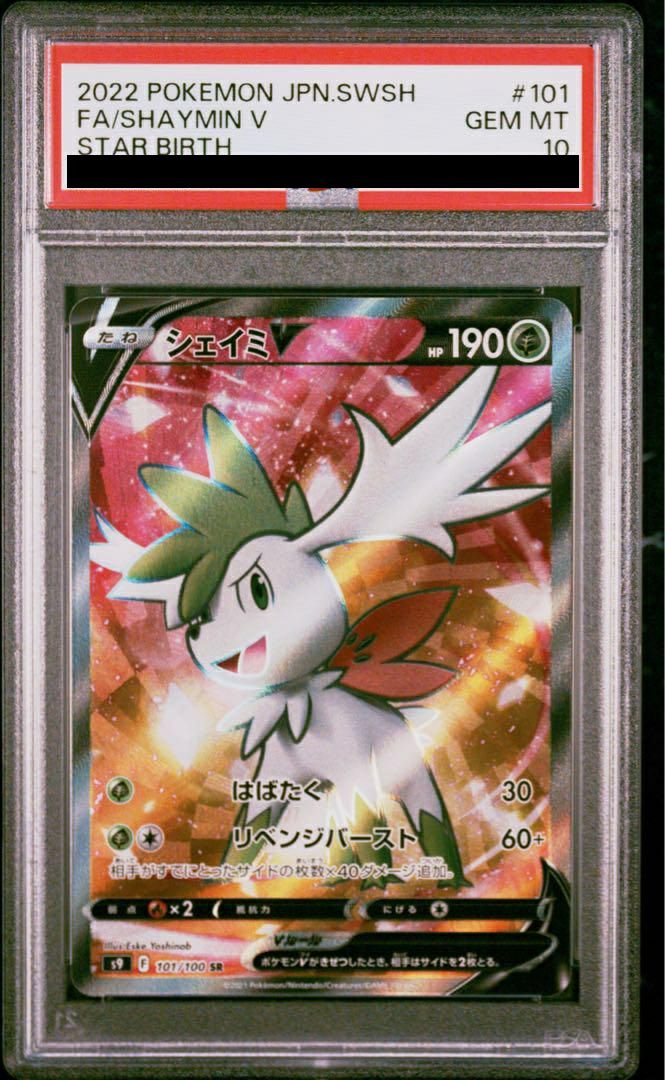 シェイミV(101/100)は、拡張パック「スターバース」に収録された草タイプのたねポケモンで、HP190を持ちます。技「はばたく」は草エネルギー1個で30ダメージを与えます。「リベンジバースト」は草エネルギー1個と無色エネルギー1個で60ダメージを与え、相手がすでに取ったサイドの枚数×40ダメージを追加します。デッキでは、終盤での高火力を狙う戦略が有効です。SR(スーパーレア)版のカードは、通常版とは異なる豪華なイラストやホログラフィック加工が施され、コレクターズアイテムとしても高い価値があります。