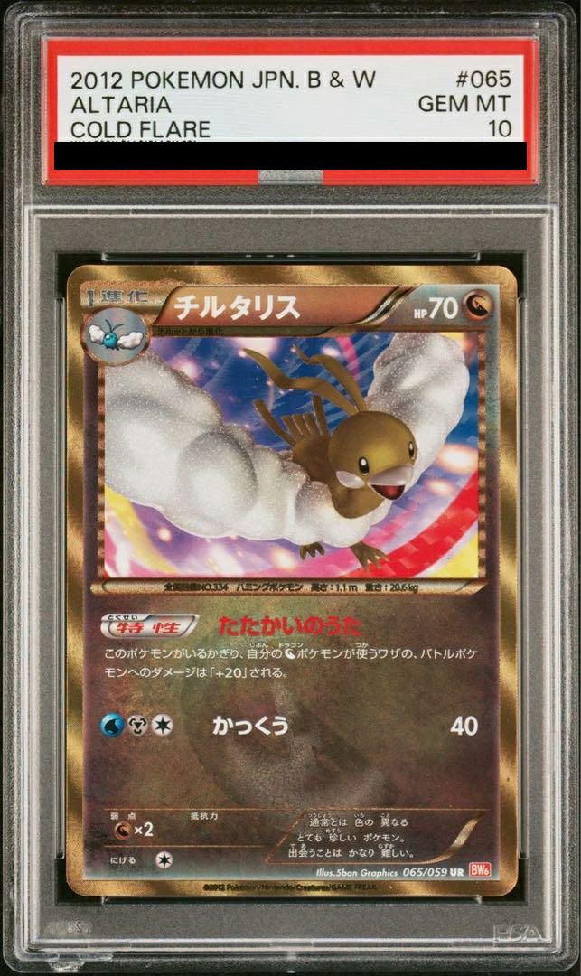 チルタリス(065/059)[UR]は、拡張パック「コールドフレア」に収録されたドラゴンタイプの1進化ポケモンカードです。HPは70で、特性「たたかいのうた」により、自分のドラゴンポケモンが使うワザのバトルポケモンへのダメージを20増加させます。ワザ「かっくう」は、水エネルギー1個と鋼エネルギー2個で40ダメージを与えます。この特性はドラゴンデッキの火力を底上げするため、ドラゴンタイプ主体のデッキでの採用が効果的です。UR(ウルトラレア)版は、豪華な光沢加工が施され、コレクターから高い評価を受けています。
