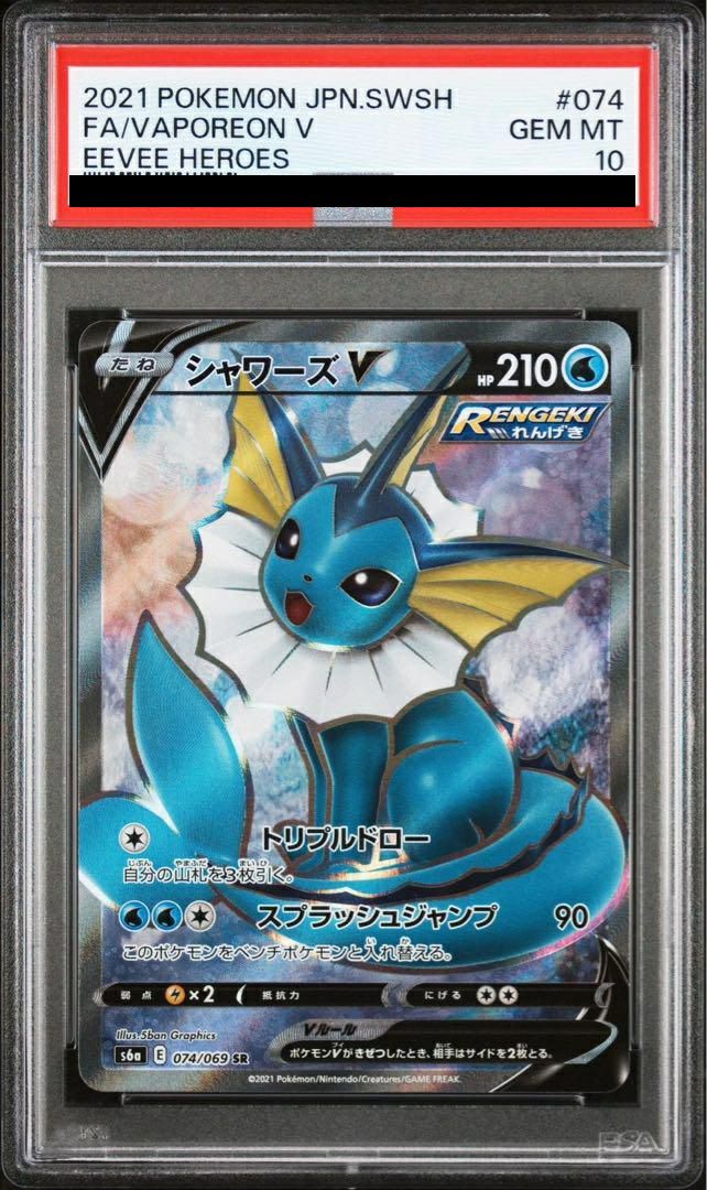 シャワーズV(074/069)は、拡張パック「イーブイヒーローズ」に収録されたスーパーレア(SR)の水タイプたねポケモンで、HPは210です。技「トリプルドロー」は無色エネルギー1個で山札を3枚引き、「スプラッシュジャンプ」は水エネルギー1個と無色エネルギー2個で90ダメージを与えた後、このポケモンをベンチポケモンと入れ替えます。デッキ構築では、手札補充とヒット&アウェイ戦術を活かし、柔軟な立ち回りが可能です。SR版のイラストは、通常版とは異なる豪華なデザインが特徴で、コレクターから高い人気を誇ります。