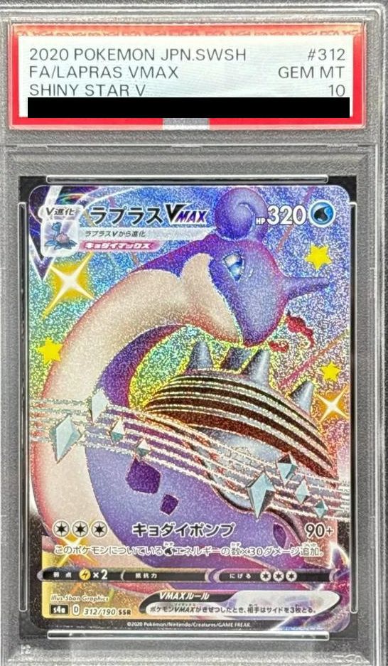 ラプラスVMAX(312/190)[SSR]は、ハイクラスパック「シャイニースターV」に収録された水タイプのポケモンVMAXで、HPは320です。ワザ「キョダイポンプ」は無色エネルギー3個で90ダメージを与え、このポケモンについている水エネルギーの数×30ダメージを追加します。デッキにおいては、水エネルギーを多く付けることで高火力を狙えるアタッカーとして活躍します。また、SSR(シークレットスーパーレア)仕様のため、色違いの特別なイラストが特徴で、コレクション価値も高い一枚です。