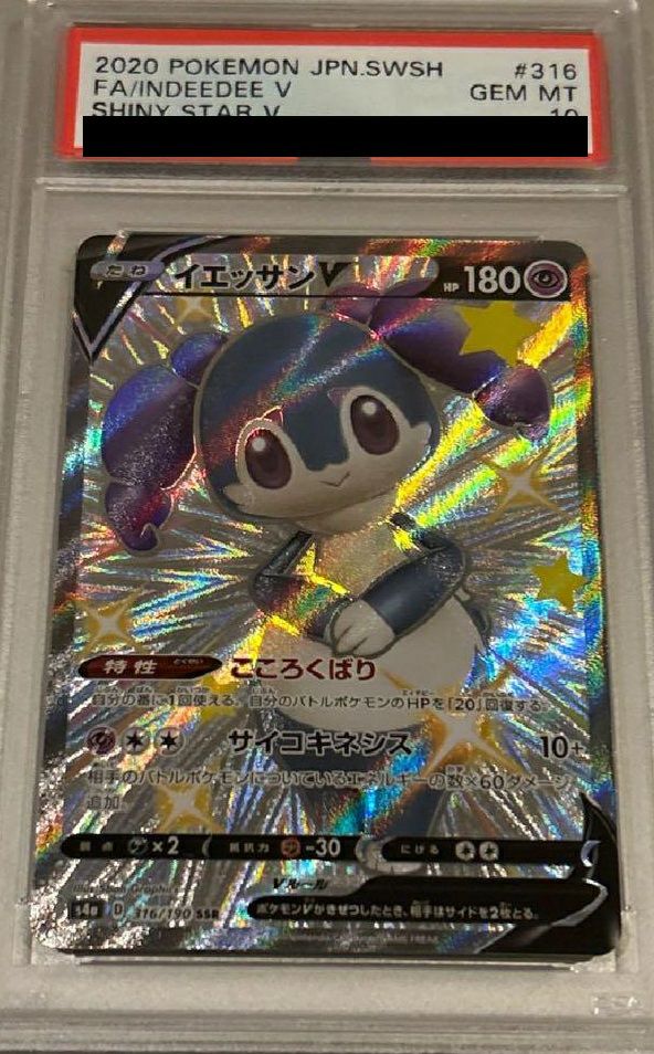 イエッサンV(316/190)は、ハイクラスパック「シャイニースターV」に収録された超タイプのたねポケモンVで、SSR(シークレットスーパーレア)仕様のカードです。特性「こころくばり」により、自分の番に1回、自分のバトルポケモンのHPを20回復できます。ワザ「サイコキネシス」は、基本ダメージ10に加え、相手のバトルポケモンについているエネルギーの数×60ダメージを追加で与えます。これにより、相手のエネルギーが多いほど高いダメージを狙うことができます。特に、エネルギーを多く必要とするデッキに対して効果的で、特性による回復も含め、バトルの主導権を握ることが可能です。SSR版のカードは、特別なイラストと光沢加工が施されており、コレクターから高い評価を受けています。