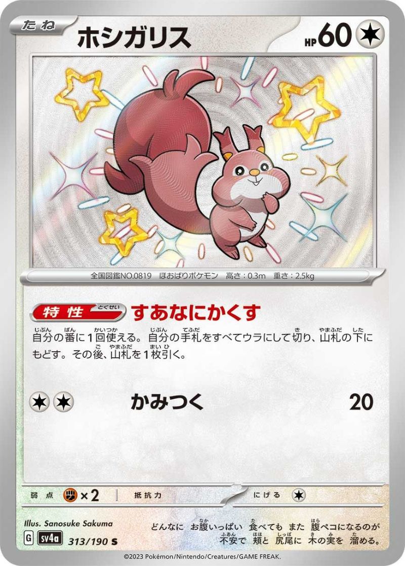 「ホシガリス」(313/190)は、ハイクラスパック「シャイニートレジャーex」に収録されたSレアリティの無色タイプのたねポケモンです。HPは110で、ワザ「はたく」は無色エネルギー1個で40ダメージを与えます。また、「タマゴころがし」は無色エネルギー2個で使用でき、コインをウラが出るまで投げ、オモテの数×60ダメージを与える効果を持ちます。弱点は闘タイプ(×2)、抵抗力はなく、逃げるためのエネルギーは無色1個です。イラストは佐久間さのすけ氏が担当しており、ホシガリスの可愛らしい姿が描かれています。その希少性と魅力的なデザインから、コレクターの間で人気を博しています。