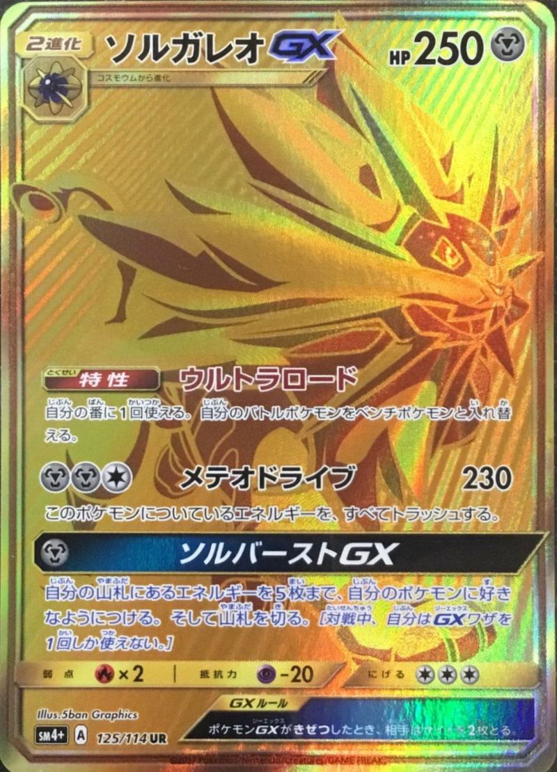 ソルガレオGX(125/114)は、鋼タイプの2進化ポケモンGXで、HPは250です。特性「ウルトラロード」により、自分の番に1回、自分のバトルポケモンをベンチポケモンと入れ替えることができます。ワザ「メテオドライブ」は鋼エネルギー2個と無色エネルギー1個で230ダメージを与え、このポケモンについているエネルギーをすべてトラッシュします。GXワザ「ソルバーストGX」は鋼エネルギー1個で、自分の山札にあるエネルギーを5枚まで自分のポケモンに好きなようにつけ、その後山札を切ります。ポケモンGXがきぜつすると、相手はサイドを2枚取ります。デッキ構築時には、特性を活かした柔軟なバトルポケモンの入れ替えや、GXワザによるエネルギー加速を戦略に組み込むと効果的です。UR(ウルトラレア)仕様のため、特別なイラストと加工が施され、コレクターズアイテムとしても人気があります。