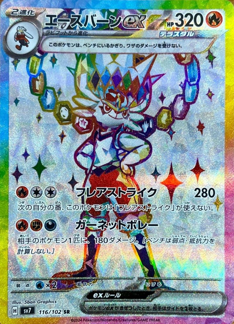 エースバーンex(116/102)は、炎タイプの2進化ポケモンで、HP320を持ちます。特性「テラスタル」により、ベンチにいる限りワザのダメージを受けません。ワザ「フレアストライク」は炎エネルギー2個と無色エネルギー1個で280ダメージを与え、次の自分の番にはこのワザが使えなくなります。「ガーネットボレー」は炎エネルギー1個、闘エネルギー1個、無色エネルギー1個で相手のポケモン1匹に180ダメージを与えます(ベンチポケモンにも攻撃可能で、弱点・抵抗力は計算しません)。これらのワザにより、高火力の攻撃やベンチ狙撃が可能で、特に「フレアストライク」はVSTARポケモンを一撃で倒すことができます。SR(スーパーレア)版のイラストは、エースバーンが炎をまといながら躍動感あふれる姿が描かれており、背景には燃え盛る炎が広がっています。このダイナミックなデザインは、コレクターズアイテムとしても高い人気を誇ります。