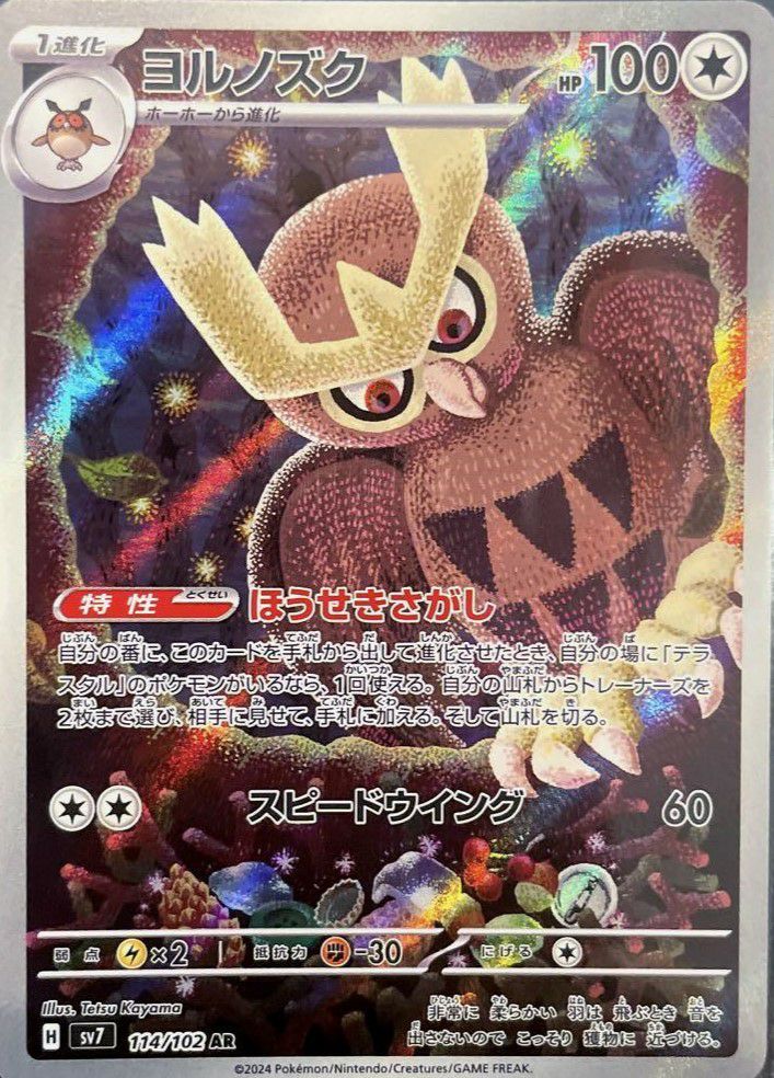 ヨルノズク(114/102)は、拡張パック「ステラミラクル」に収録された無色タイプの1進化ポケモンで、HPは100です。特性「ほうせきさがし」は、このカードを手札から出して進化させたとき、自分の場に「テラスタル」のポケモンがいるなら、自分の山札からトレーナーズを2枚まで選び、手札に加えることができます。ワザ「スピードウイング」は、無色エネルギー2個で60ダメージを与えます。この特性により、デッキから必要なトレーナーズを素早く手札に加えることができ、戦略的な展開をサポートします。AR(アートレア)版は、美麗なイラストが特徴で、コレクション性が高いカードです。
