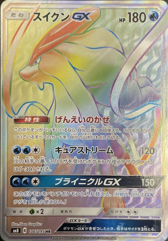 スイクンGX(106/095)[HR]は、水タイプのたねポケモンで、HPは180です。特性「げんえいのかぜ」により、このポケモンがベンチにいるとき、自分の番に1回、このポケモンとついているすべてのカードを山札に戻して切ることができます。ワザ「キュアストリーム」は水エネルギー2個と無色エネルギー1個で120ダメージを与え、次の相手の番、このワザを受けたポケモンが使うワザのダメージを30減らします。GXワザ「ブライニクルGX」は水エネルギー2個と無色エネルギー1個で150ダメージを与え、このポケモンをベンチポケモンと入れ替えます。弱点は草タイプ(×2)、逃げるためのエネルギーは2個です。HR(ハイパーレア)仕様のため、通常版よりも希少価値が高く、美麗なイラストが特徴で、コレクターに人気があります。