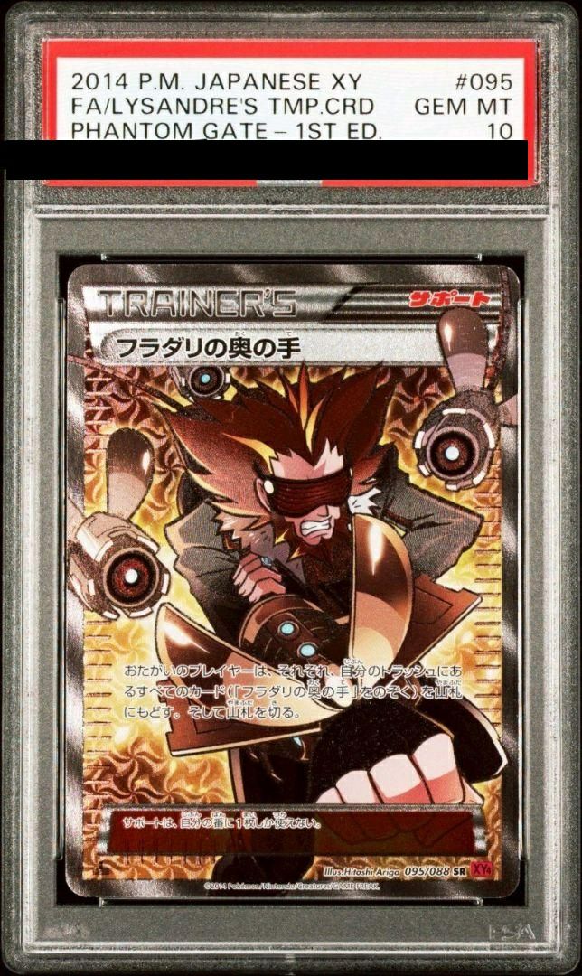 フラダリの奥の手(095/088)[SR]は、拡張パック「ファントムゲート」に収録されたサポートカードのスーパーレア(SR)バージョンです。このカードを使用すると、お互いのプレイヤーはそれぞれ、自分のトラッシュにあるすべてのカード(「フラダリの奥の手」を除く)を山札に戻し、シャッフルします。この効果により、トラッシュのリソースを再利用できる一方、相手にも同様の恩恵を与えるため、使用タイミングが重要となります。しかし、強力すぎる効果のため、2015年6月15日以降、全てのレギュレーションで使用禁止カードに指定されています。イラストは有賀ヒトシ氏が手掛けており、SR仕様の特別なデザインが施されています。