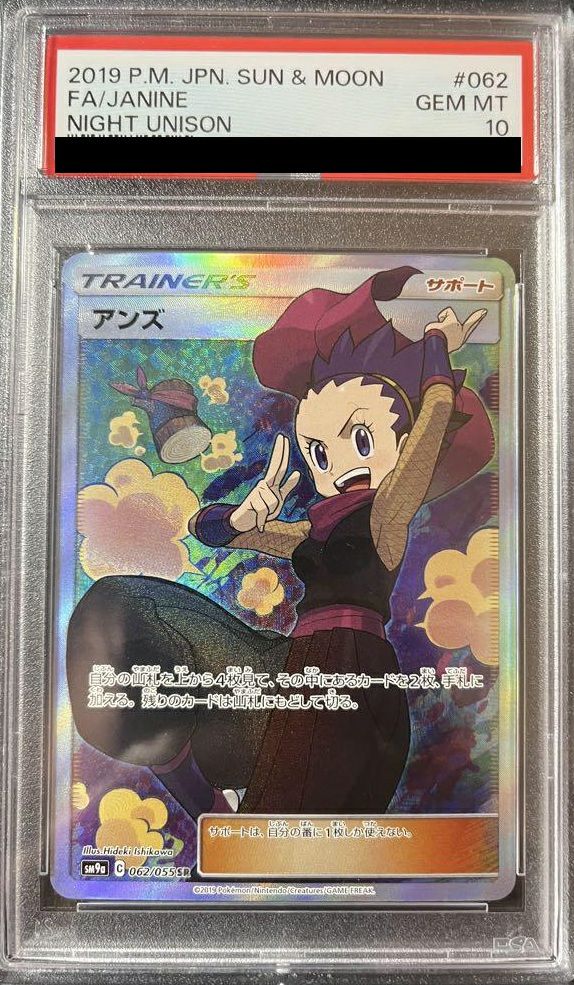 アンズ(062/055)は、強化拡張パック「ナイトユニゾン」に収録されたサポートカードで、スーパーレア(SR)仕様です。このカードを使用すると、自分の山札の上から4枚を見て、その中から2枚を手札に加え、残りのカードを山札に戻して切ることができます。これにより、必要なカードを手札に加えつつ、デッキの循環を促進できます。SR版は、特別なイラストが施されており、コレクターから高い評価を受けています。