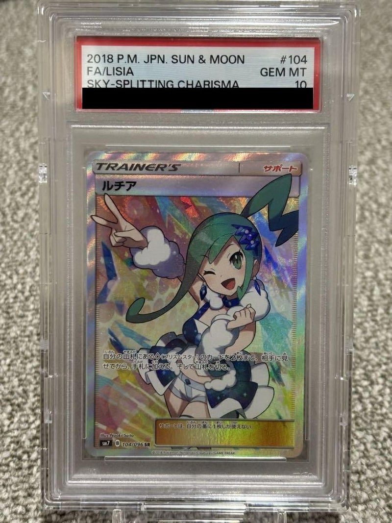 ルチア(104/096)は、拡張パック「裂空のカリスマ」に収録されたサポートカードのスーパーレア(SR)版です。このカードの効果は、自分の山札から「ポケモンGX」を2枚まで選び、相手に見せてから手札に加えるというものです。その後、山札を切ります。デッキの主要ポケモンGXを早期に手札に加えられるため、展開を加速させる重要な役割を果たします。イラストはさいとうなおき氏が手掛け、ステージ上でポーズを決めるルチアが描かれた華やかなデザインが特徴で、コレクターやプレイヤーの間で高い人気を誇ります。