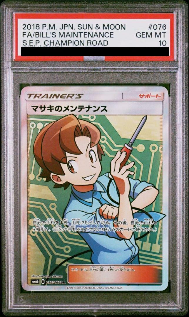 マサキのメンテナンス(076/066)は、サポートカードで、自分の手札を1枚山札に戻してシャッフルした後、山札から3枚引く効果を持ちます。手札調整やデッキの回転率を高めるサポートとして活躍します。SR(スーパーレア)版は、特別なイラストとホログラフィック加工が施された豪華なデザインが特徴です。