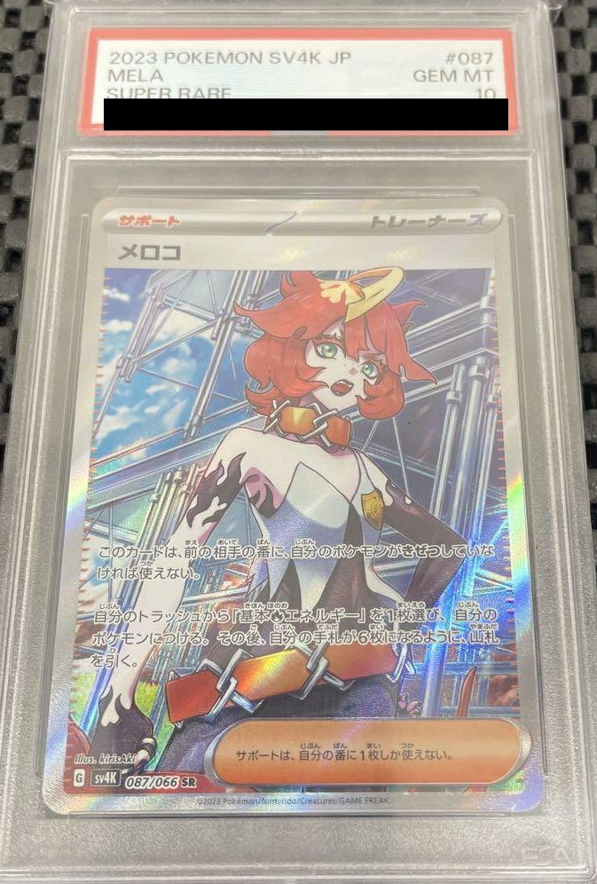 メロコ(087/066)は、拡張パック「古代の咆哮」に収録されたスーパーレア(SR)のサポートカードです。このカードは、前の相手の番に自分のポケモンがきぜつしていなければ使用できません。使用すると、自分のトラッシュから基本炎エネルギーを1枚選び、自分のポケモンにつけ、その後、手札が6枚になるように山札を引きます。これにより、炎エネルギーの再利用と手札補充が同時に行え、炎デッキの安定性を高めます。SR仕様のカードは、豪華な光沢加工が施され、コレクション性が高いのが特徴です。