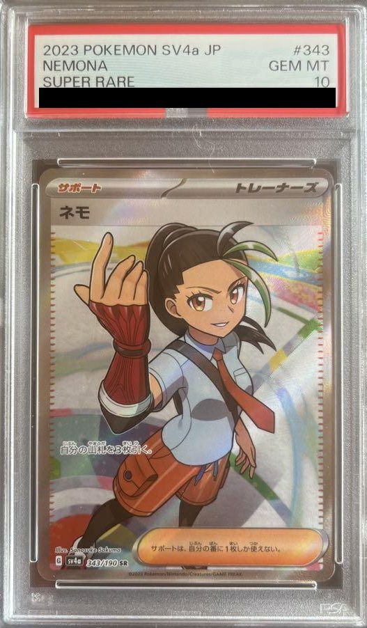 ネモ(343/190)は、ハイクラスパック「シャイニートレジャーex」に収録されたサポートカードのスーパーレア(SR)版です。このカードは、自分の山札を3枚引く効果を持ち、デッキのドローエンジンとして活躍します。SR版は、通常版とは異なる豪華なイラストや加工が施され、コレクターズアイテムとしても人気があります。