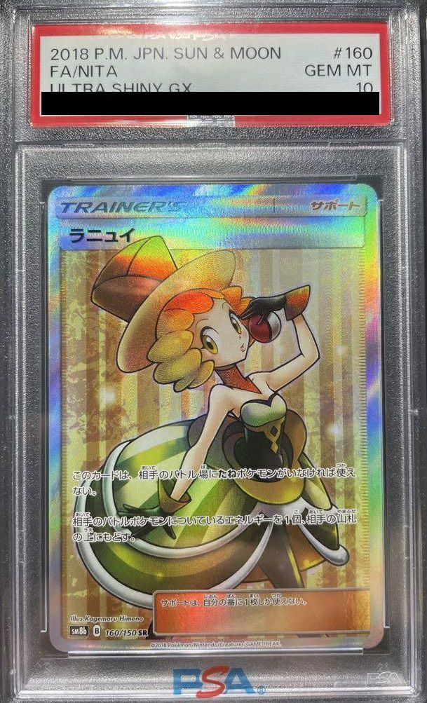 ラニュイ(160/150)[SR]は、ハイクラスパック「GXウルトラシャイニー」に収録されたサポートカードです。このカードは、相手のバトル場にたねポケモンがいる場合にのみ使用可能で、相手のバトルポケモンについているエネルギーを1個、相手の山札の上に戻す効果を持ちます。デッキにおいては、相手のエネルギー供給を妨害し、戦略的な優位性を確立するために活用されます。また、SR(スーパーレア)仕様のため、コレクション価値も高い一枚です。