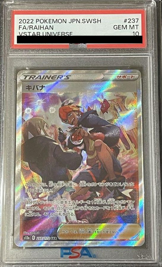 キバナ(237/172)は、ハイクラスパック「VSTARユニバース」に収録されたサポートカードで、前の相手の番に自分のポケモンがきぜつしていなければ使用できません。効果として、自分のトラッシュから基本エネルギーを1枚選び、自分のポケモンにつけ、その後、山札から好きなカードを1枚手札に加えます。これにより、エネルギー加速と必要なカードのサーチが同時に行え、特に中盤以降の展開力を高めるのに有効です。SAR(スペシャルアートレア)版は、特別なイラストが施され、コレクション性が高いです。