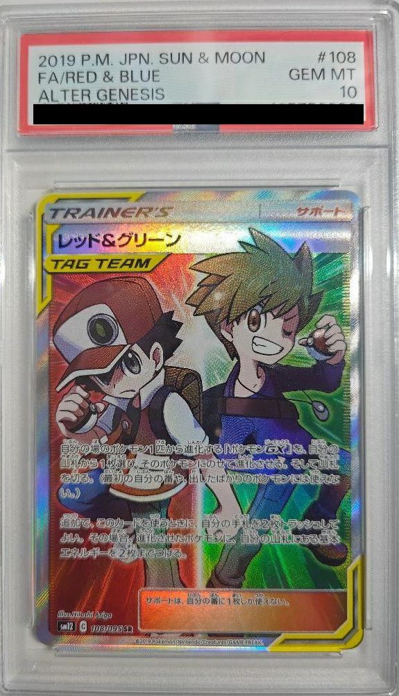 レッド&グリーン(108/095)[SR]は、拡張パック「オルタージェネシス」に収録されたサポートカードです。このカードを使用すると、自分の場のポケモン1匹を山札から進化する「ポケモンGX」に進化させることができます。さらに、手札を2枚トラッシュすることで、進化させたポケモンに山札から基本エネルギーを2枚まで付けることが可能です。これにより、素早くポケモンGXを場に出し、エネルギーを供給する戦略が取れます。ただし、最初の番や出したばかりのポケモンには使用できない点に注意が必要です。また、サポートカードは1ターンに1枚しか使えません。このカードは、進化とエネルギー加速を同時に行えるため、特定のデッキ戦略において非常に有用です。