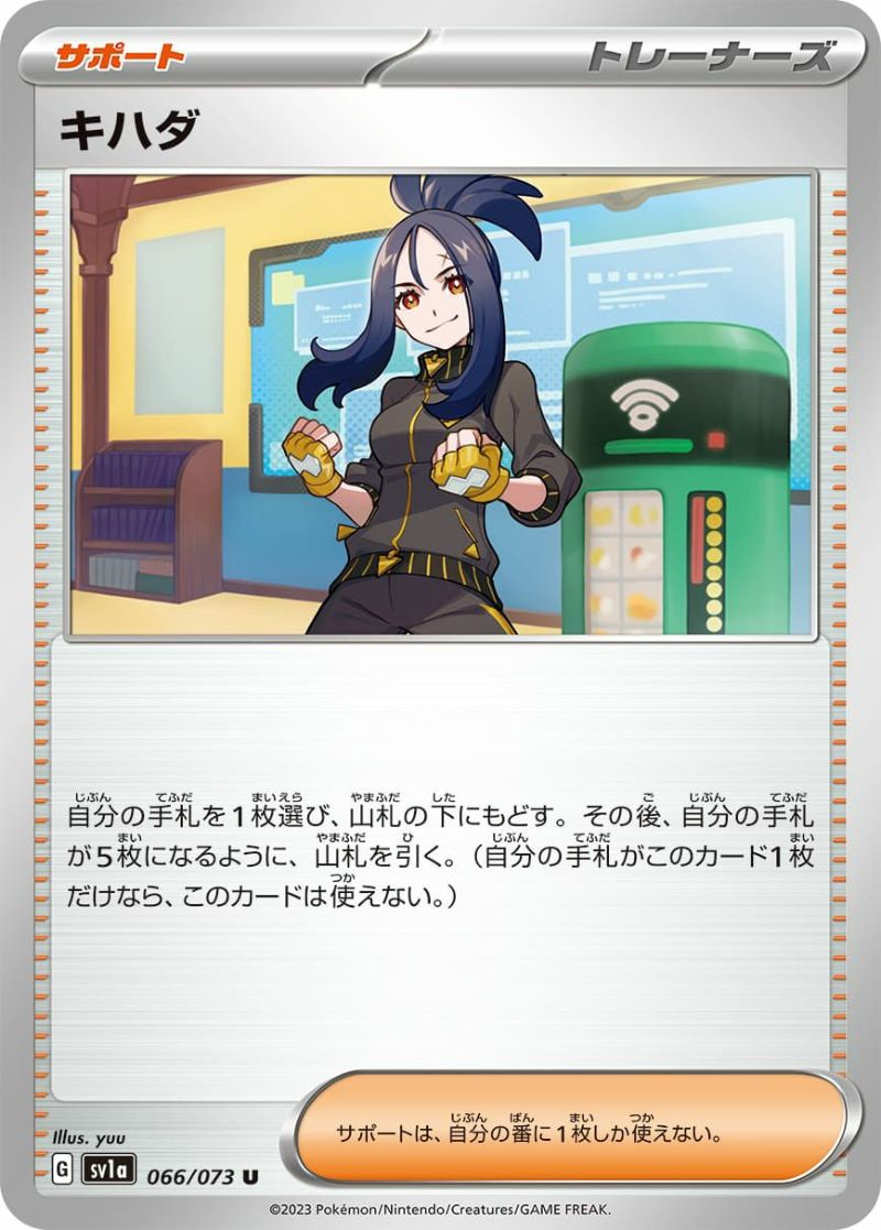 キハダ(066/073)は、強化拡張パック「トリプレットビート」に収録されたサポートカードです。このカードを使用すると、手札から1枚を山札の下に戻し、その後、手札が5枚になるように山札からカードを引きます。ただし、手札がこのカード1枚のみの場合は使用できません。この効果により、手札の調整とドロー加速が可能となり、デッキの安定性を高める役割を果たします。