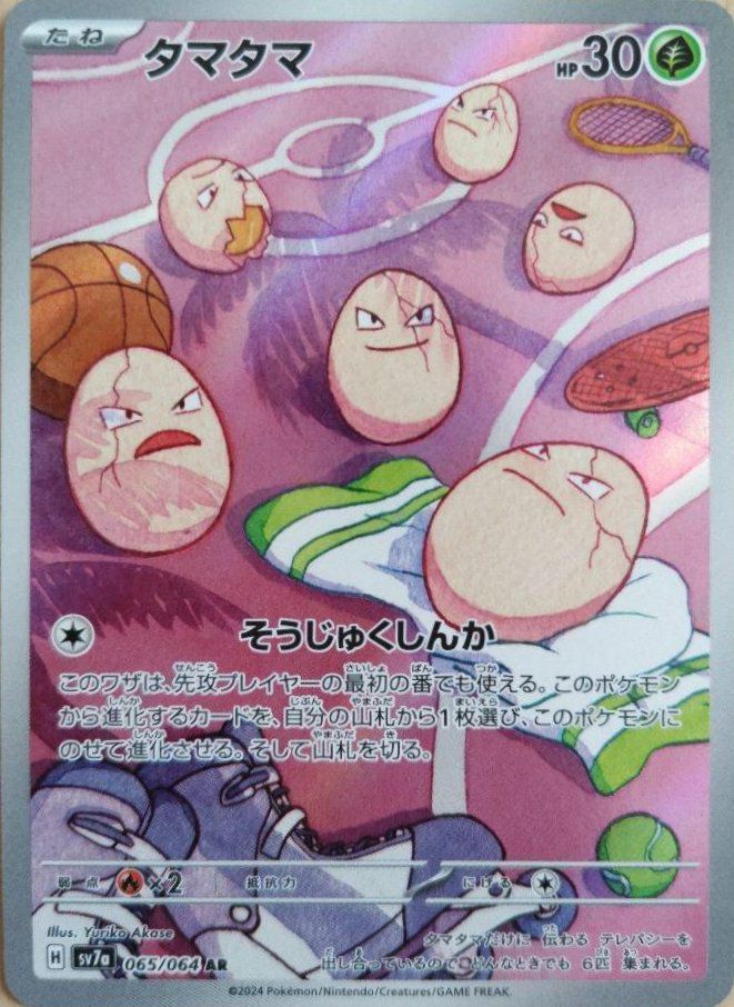 タマタマ(065/064)は、強化拡張パック「楽園ドラゴーナ」に収録されたアートレア(AR)の草タイプたねポケモンで、HPは30です。ワザ「そうじゅくしんか」は、無色エネルギー1個で使用でき、先攻プレイヤーの最初の番でも使えます。このワザにより、タマタマから進化するカードを山札から1枚選び、このポケモンにのせて進化させることができます。これにより、素早く進化させる戦略が可能となります。イラストはTetsu Kayama氏が担当し、タマタマの個性的な姿が描かれています。