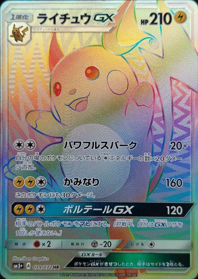 ライチュウGX(079/072)[HR]は、強化拡張パック「ひかる伝説」に収録された雷タイプの1進化ポケモンGXで、HPは210です。技「パワフルスパーク」は無色エネルギー2個で、自分の場のポケモンについている雷エネルギーの数×20ダメージを追加します。「かみなり」は雷エネルギー2個と無色エネルギー1個で160ダメージを与え、このポケモンにも30ダメージを受けます。GX技「ボルテールGX」は雷エネルギー2個と無色エネルギー1個で120ダメージを与え、相手のバトルポケモンをマヒにします。デッキでは、エネルギーを多く展開することで「パワフルスパーク」の火力を高め、「ボルテールGX」で相手の行動を制限する戦術が有効です。このカードはハイパーレア(HR)仕様で、イラストレーターは5ban Graphics氏が担当しています。