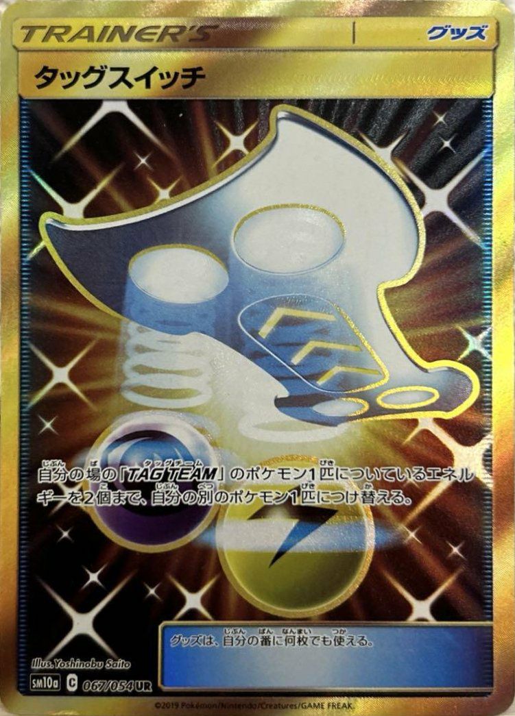 タッグスイッチ(067/054)は、強化拡張パック「ジージーエンド」に収録されたウルトラレアのグッズカードです。このカードを使用すると、自分の場のTAG TEAMポケモン1匹に付いているエネルギーを2個まで選び、自分の別のポケモン1匹に付け替えることができます。これにより、エネルギーの再配置が可能となり、戦況に応じた柔軟な戦略を展開できます。グッズカードは自分の番に何枚でも使用できるため、タッグスイッチを活用することでデッキのエネルギー管理を効率的に行うことが可能です。イラストはToyste Beach氏が担当し、洗練されたデザインが特徴です。