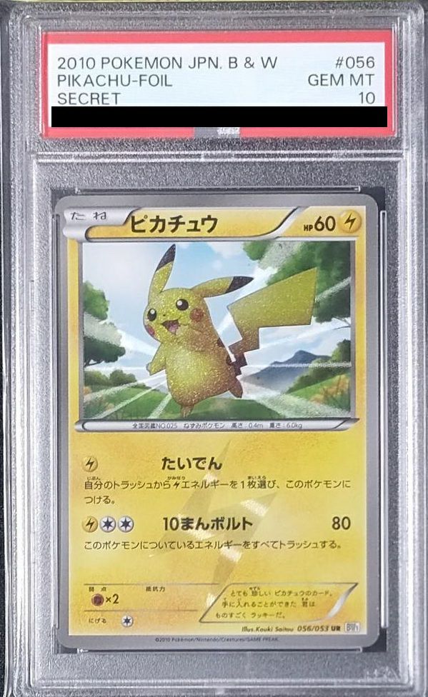 ピカチュウ(056/053)は、拡張パック「ホワイトコレクション」に収録された雷タイプのたねポケモンで、HPは60です。ワザ「たいでん」は、トラッシュから雷エネルギーを1枚選び、このポケモンにつけることができ、「10まんボルト」は80ダメージを与えますが、このポケモンについているエネルギーをすべてトラッシュします。UR(ウルトラレア)仕様で、封入率が低く希少性が高いため、コレクターの間で高い人気を誇ります。