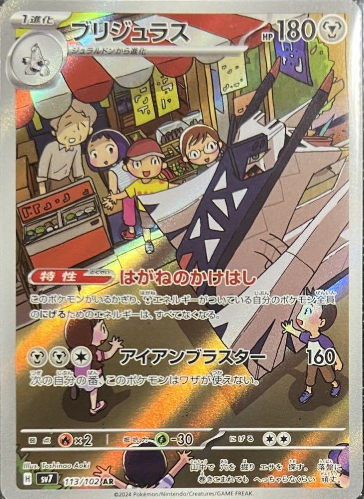 ブリジュラス(113/102)は、拡張パック「ステラミラクル」に収録された鋼タイプの1進化ポケモンで、HPは180です。特性「はがねのかけはし」により、このポケモンが場にいる限り、エネルギーがついている自分のポケモン全員のにげるためのエネルギーがなくなります。ワザ「アイアンブラスター」は鋼エネルギー2つと無色エネルギー1つで160ダメージを与えますが、次の自分の番、このポケモンはワザが使えなくなります。弱点は炎タイプ、抵抗力は草タイプで、にげるためのコストは3です。特性を活かして、エネルギーを節約しつつ柔軟な立ち回りが可能となります。