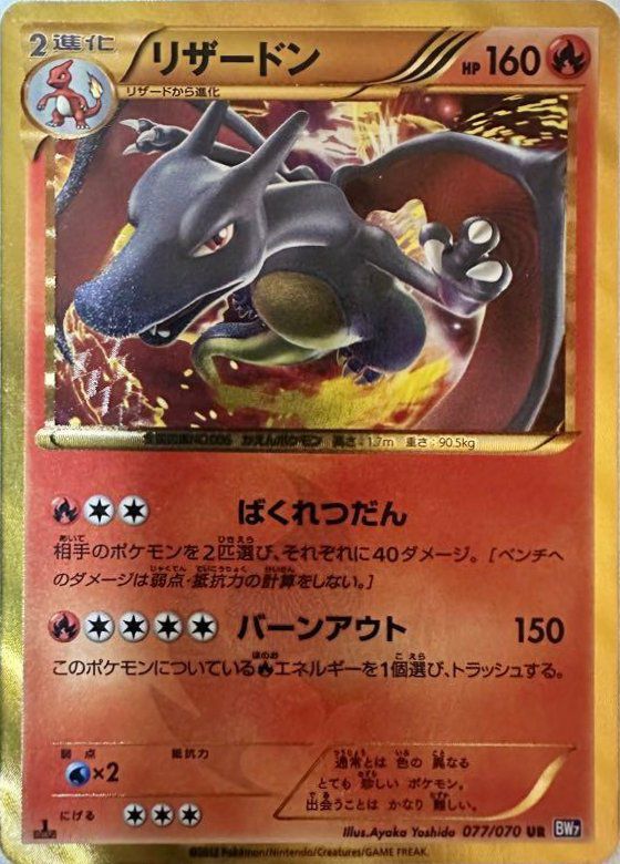 リザードン(077/070)は、2012年9月14日に発売された拡張パック「プラズマゲイル」に収録されたウルトラレア(UR)の炎タイプ2進化ポケモンで、初版(1ED)バージョンです。HPは160で、ワザ「ばくれつだん」は無色エネルギー3個で相手のポケモン2匹にそれぞれ40ダメージを与えます(ベンチへのダメージは弱点・抵抗力を計算しません)。「バーンアウト」は炎エネルギー2個と無色エネルギー2個で150ダメージを与え、このポケモンに付いている炎エネルギーを1個トラッシュします。弱点は水タイプ(×2)、抵抗力はなく、逃げるためのエネルギーは3個です。デッキでは、高い攻撃力を持つアタッカーとして活躍します。特に、複数のポケモンにダメージを与える「ばくれつだん」は、相手のベンチポケモンを狙う戦術に有効です。また、色違いの黒いリザードンが描かれており、コレクターから高い評価を受けています。