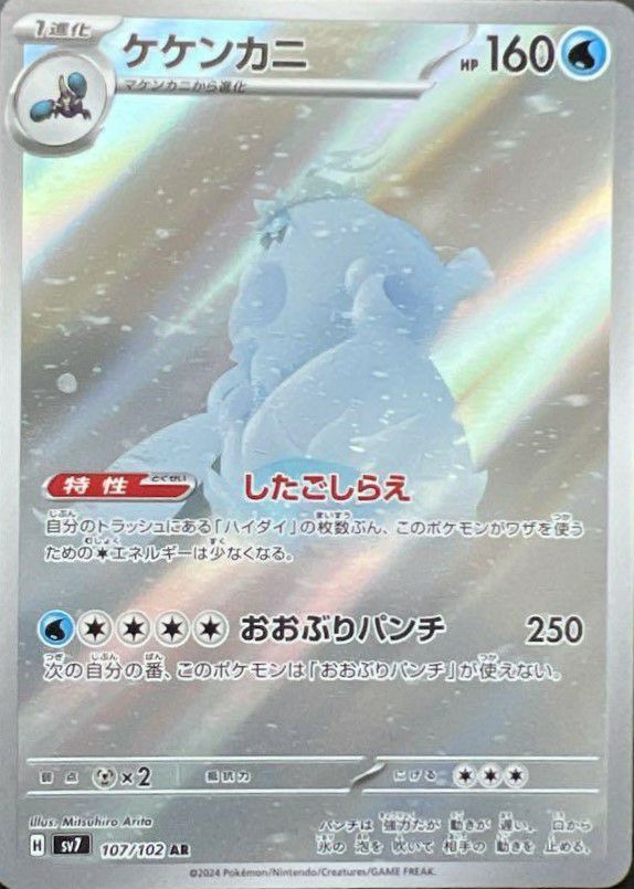 ケケンカニ(107/102)[AR]は、拡張パック「ステラミラクル」に収録された水タイプの1進化ポケモンで、HP160を持ちます。特性「したごしらえ」は、自分のトラッシュにある「ハイダイ」の枚数分、このポケモンのワザに必要な無色エネルギーを減らす効果があります。ワザ「おおぶりパンチ」は、水エネルギー1個と無色エネルギー3個で250ダメージを与えますが、次の自分の番にこのワザを使えません。弱点は鋼タイプで、逃げるためのエネルギーは3つです。デッキでは、「ハイダイ」を多くトラッシュに送り、特性を活用することで、強力な攻撃を早期に繰り出す戦術が有効です。AR(アートレア)版のイラストは、ケケンカニの特徴を魅力的に描いており、コレクション性も高いです。