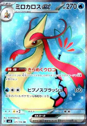 ミロカロスex(121/106)は、水タイプの1進化ポケモンで、HPは270です。特性「きらめくウロコ」により、相手の「テラスタル」のポケモンからワザのダメージや効果を受けません。ワザ「ヒプノスプラッシュ」は160ダメージを与え、相手のバトルポケモンをねむり状態にします。このカードはスーパーレア(SR)版で、美麗なイラストが特徴です。特性を活かして特定の相手の攻撃を無効化しつつ、高火力と状態異常を組み合わせた戦術が可能です。