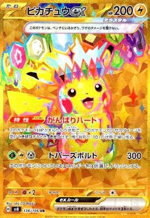 ピカチュウex(136/106)は、拡張パック「超電ブレイカー」に収録された雷タイプのたねポケモンで、HPは200です。特性「がんばりハート」により、HPが満タンの状態でワザのダメージを受けて気絶する際、残りHP10で場に留まります。ワザ「トパーズボルト」は300ダメージを与えますが、このポケモンについているエネルギーを3個トラッシュする必要があります。UR(ウルトラレア)仕様で、カード全体がゴールドに輝く特別なデザインが施されており、コレクション性が高い一枚です。