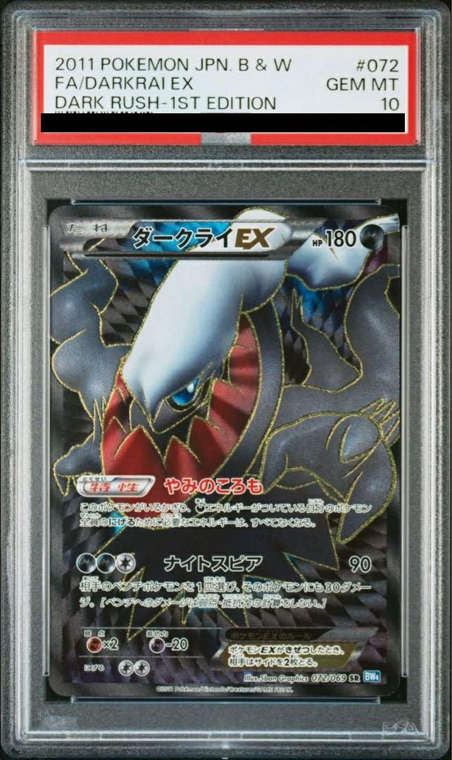 ダークライEX(072/069)は、悪タイプのたねポケモンEXで、HPは180です。特性「やみのころも」により、このポケモンが場にいる限り、自分のポケモン全員のにげるために必要なエネルギーがなくなります。ワザ「ナイトスピア」は、90ダメージを与え、さらに相手のベンチポケモン1匹にも30ダメージを与えることができます。これにより、バトル場とベンチの両方にダメージを与える戦術が可能です。SR(スーパーレア)仕様のため、コレクション価値も高い一枚です。